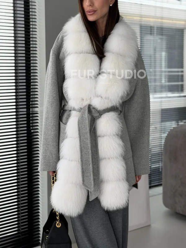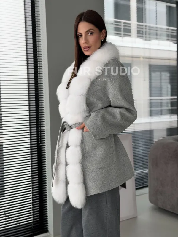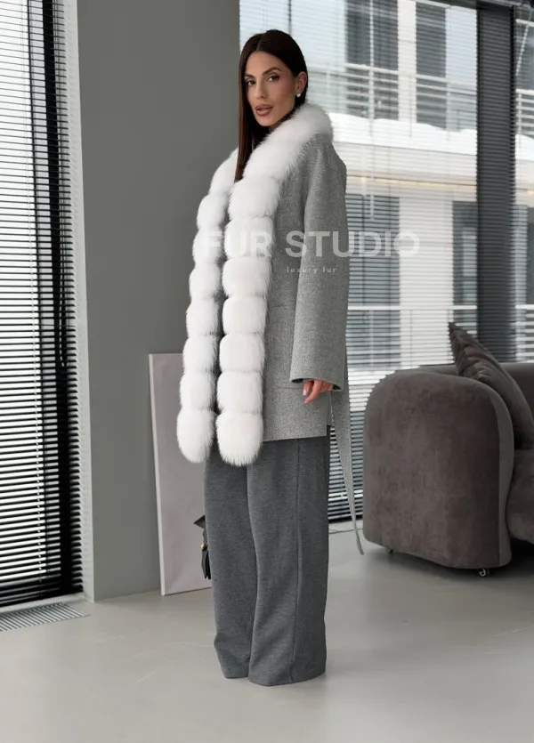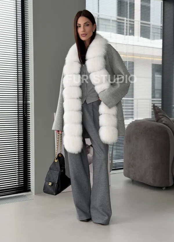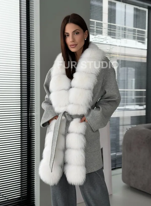 Серое пальто с меховым воротником 102909